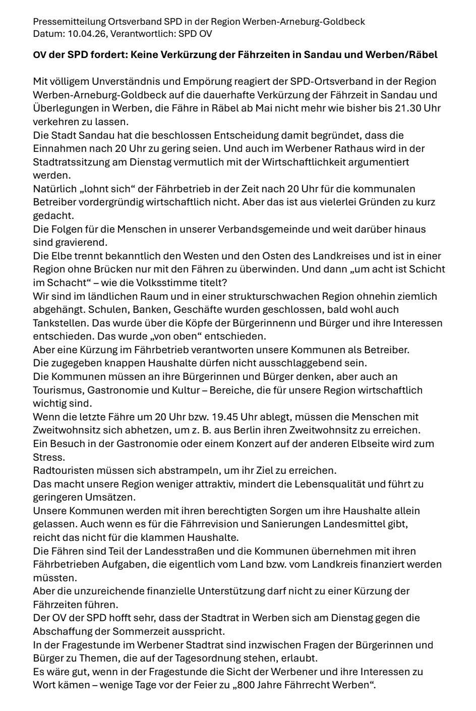 Ich bitte Sie, hierzu folgende Pressemitteilung der Parteien LINKE und SPD in Arneburg Goldbeck in Ihrer Berichterstattung zu berücksichtigen.